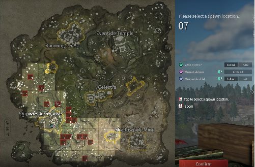 - การเลือกเกิด เกมไม่มีโดดร่ม แต่สามารถเลือกสถานที่เกิดได้ในแผนที่ต้นเกมว่าจะเลือกจุดไหน ให้สังเกตตรงขอบทองของแต่ละสถานที่ว่ามีของให้เก็บ (ทรัพยากร) เยอะไหม โดยที่เราจะเห็นผู้เล่นอื่นๆได้ว่าจะเกิดตรงไหนได้อีกด้วย