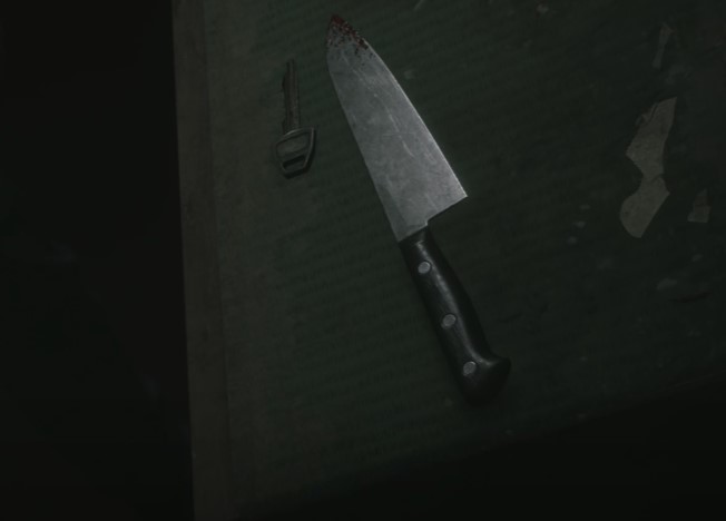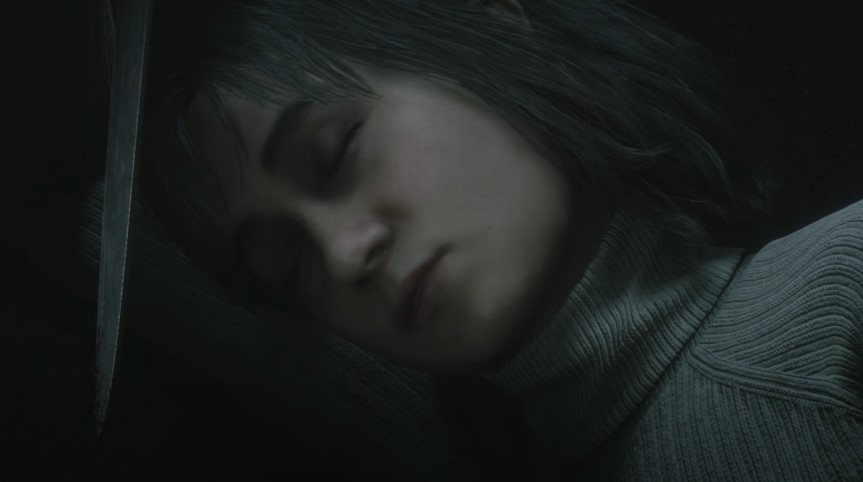 ภายในห้องที่มีขวดสุราบนทีวี และตุ๊กตาหมีวางอยู่ข้างประตู เจมส์ได้เห็นหญิงสาวที่เพิ่งพบพานมากำลังนอนถือมีดอยู่