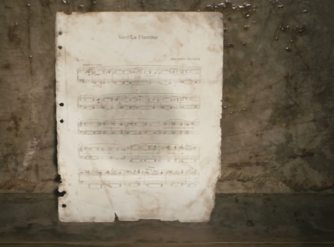 - เดินตรงมาผ่านประตูใหญ่อีกบาน จะเจอเปียโนพร้อมโน๊ต Vers La Flmme Alexander Scriabin